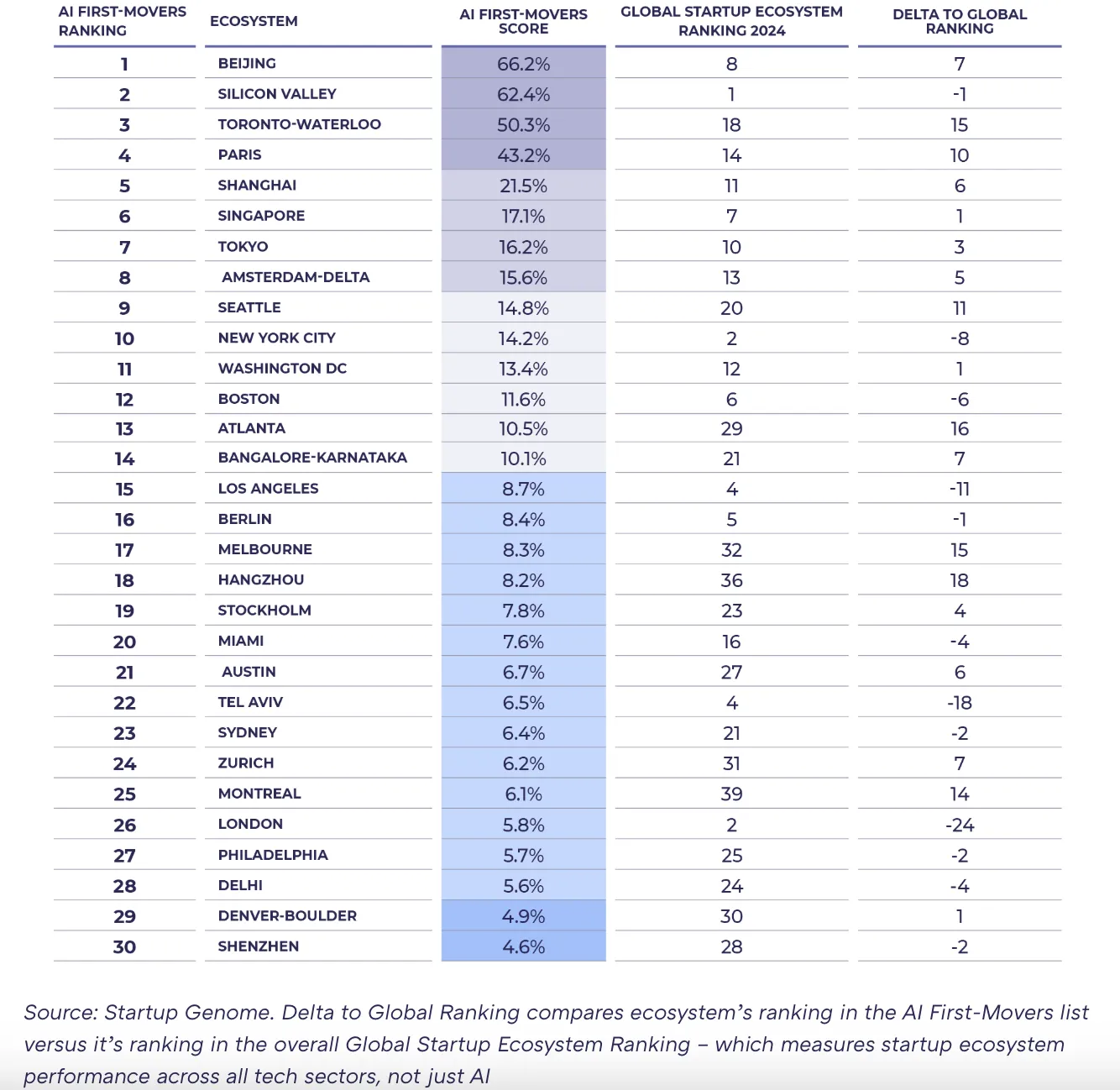 Only eight ecosystems are “AI-native”: they direct ≥15% of funding to startups built on AI-first DNA.