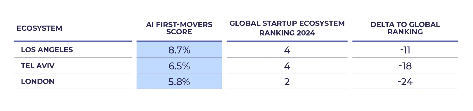 These eight ecosystems are the highest ranking geographies in our AI First-Mover Ecosystem Score. The score measures the share of all funding in the ecosystem that went to AI-native companies.