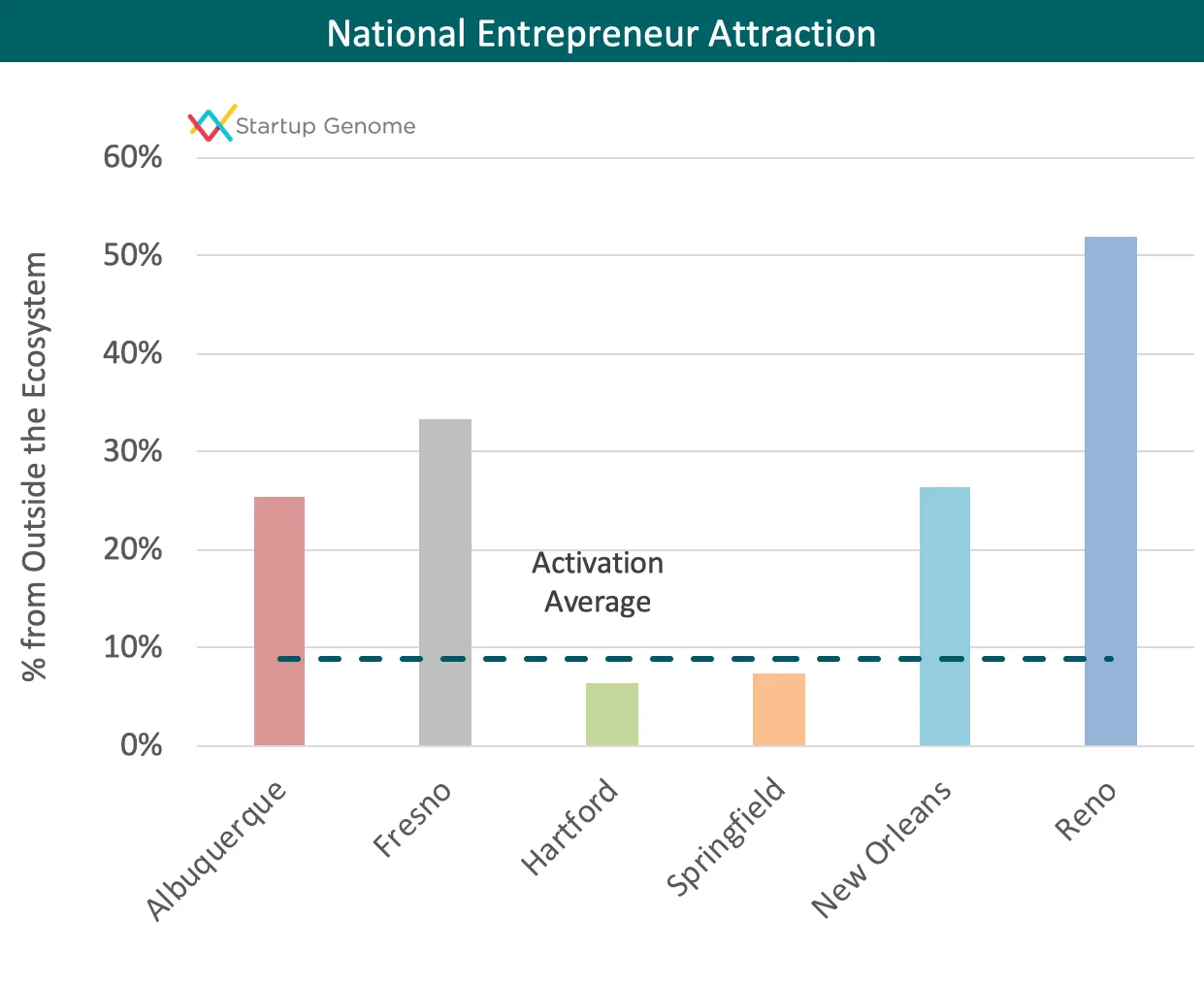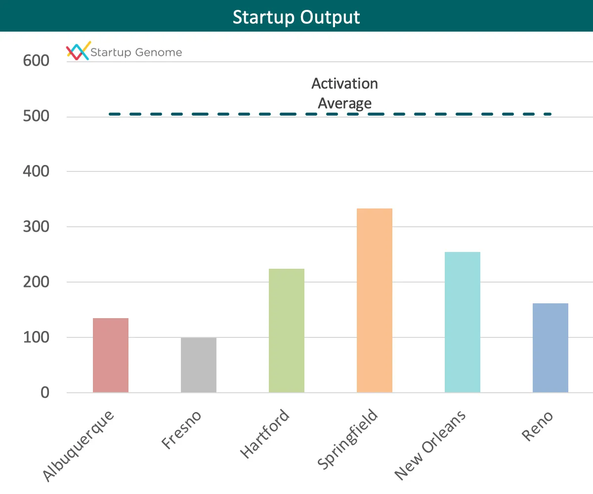 One way to increase Global Market Reach is by building Global Connectedness: meaningful relationships between founders across ecosystems. In particular, being connected with the world’s leading ecosystems helps import know-how, ambition, and awareness into an ecosystem. (See our article here for greater detail.) It is common, at the early Activation phase, to have low levels of Global Connectedness and Global Market Reach. That is what we find here. Importantly, what we measured so far is only connections between these six cities and the top global ecosystems (such as Silicon Valley, Tel Aviv, and Berlin). It is entirely possible, and quite likely, that startups in Fresno or Springfield have good connections to other ecosystems.