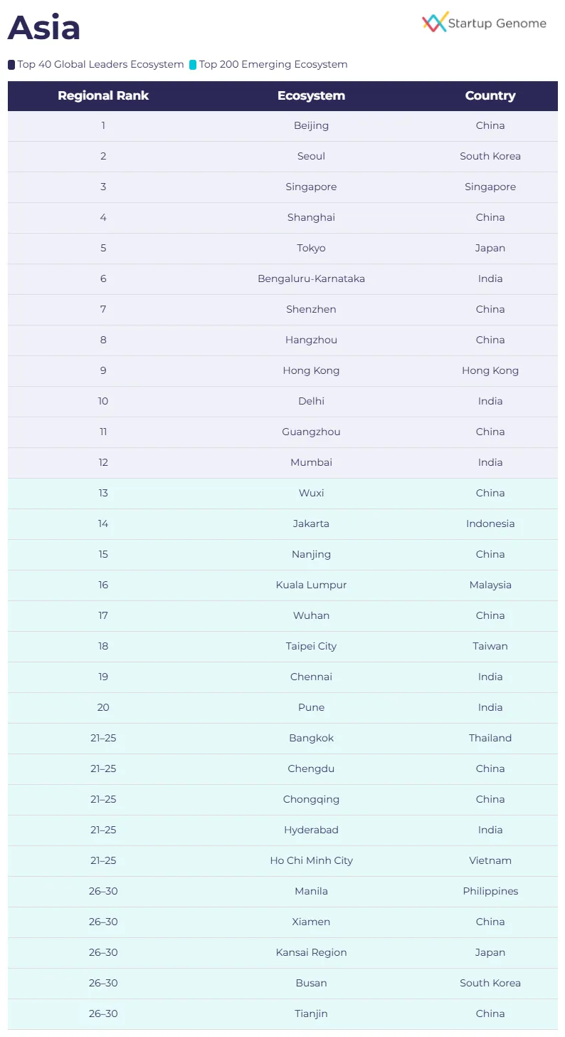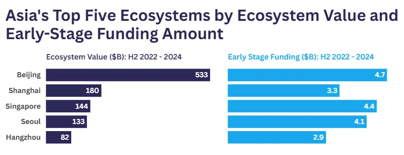 - In a tie with Boston at #5, Beijing is the top-ranked Asian ecosystem in the GSER 2025. Unicorn Moonshot AI is the ecosystem’s top valued at $5 billion.