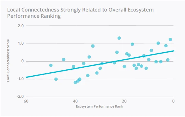 Sense of Community does correlate highly with indicators of overall ecosystem performance such as Startup Output, exits, startup valuations, exits, unicorns, and ecosystem value. A higher level of Local Relationships is also positively correlated with ecosystem performance.