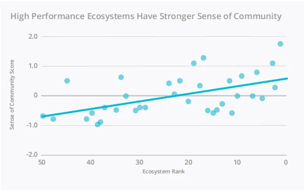 Beyond relationship-building, a healthy Sense of Community fostered by founders helping each other is highly correlated with overall ecosystem performance.