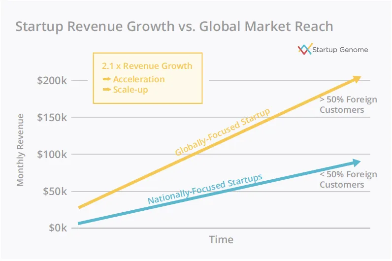As prior Startup Genome research established, startups that focus on and penetrate global markets from their earliest stage are able to grow revenues twice as fast (see Figure).