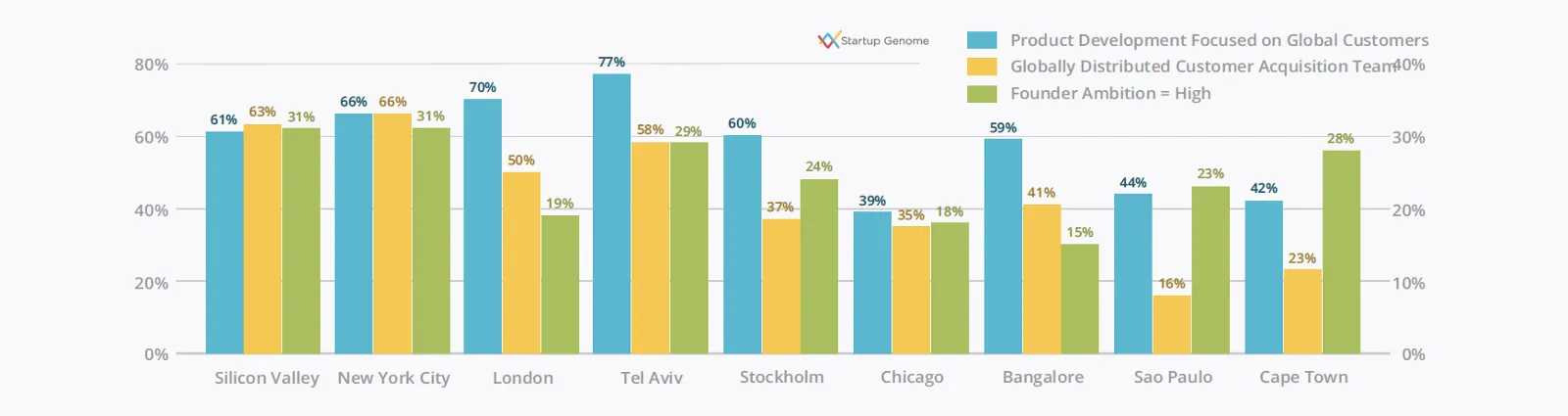 In Stockholm, extensive connections to this global fabric have led to a higher likelihood that startups there are developing products with global customers in mind. Horizons are lower in Chicago due to a lack of Global Connectedness: fewer startups in Chicago say (in our survey) that they are developing products for global markets.