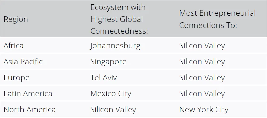 In each region of the world, the most connected ecosystems are those with the most connections to Silicon Valley. The exception, of course, is North America, where Silicon Valley is the dominant startup ecosystem — it has the most connections to New York City, followed by London and Tel Aviv.