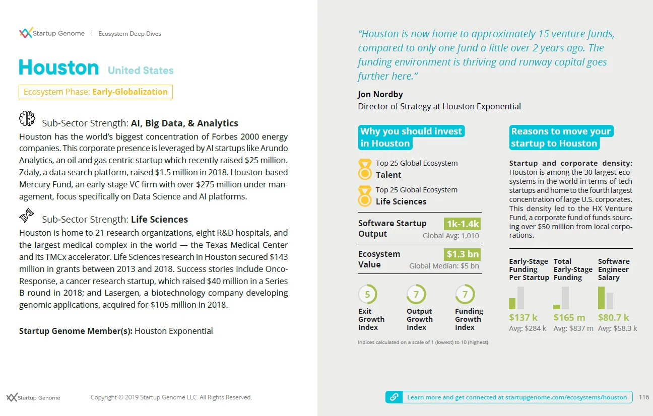 In our 2019 assessment of Houston we ranked the city against 40+ other startup ecosystems. Highlights include: