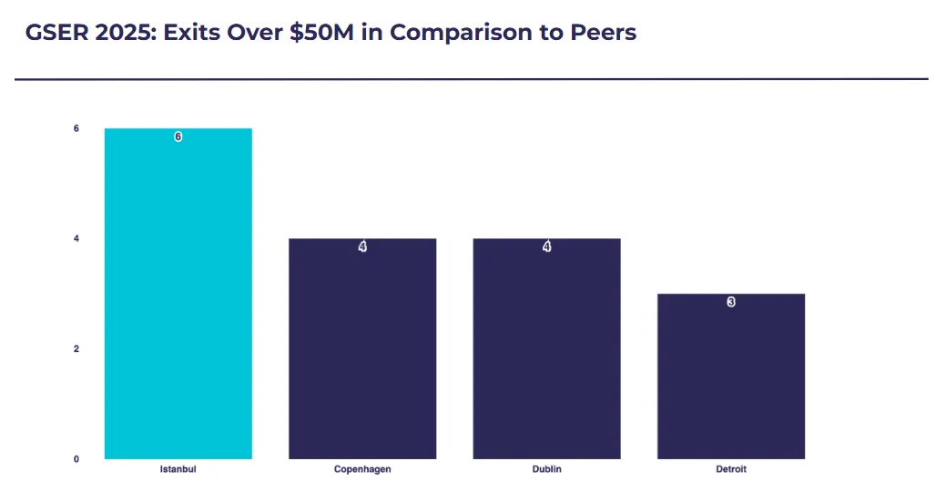 The numbers paint a compelling portrait of Istanbul’s breakout year. Between H2 2022 and 2024, Istanbul attracted $551 million in early-stage funding, with a median Seed round of $487,000 and Series A median of $2 million. Total VC funding in the GSER 2025 reached $6.3 billion, a dramatic leap from the $2.6 billion recorded in the GSER 2024 — a more than 142% increase in just one year.