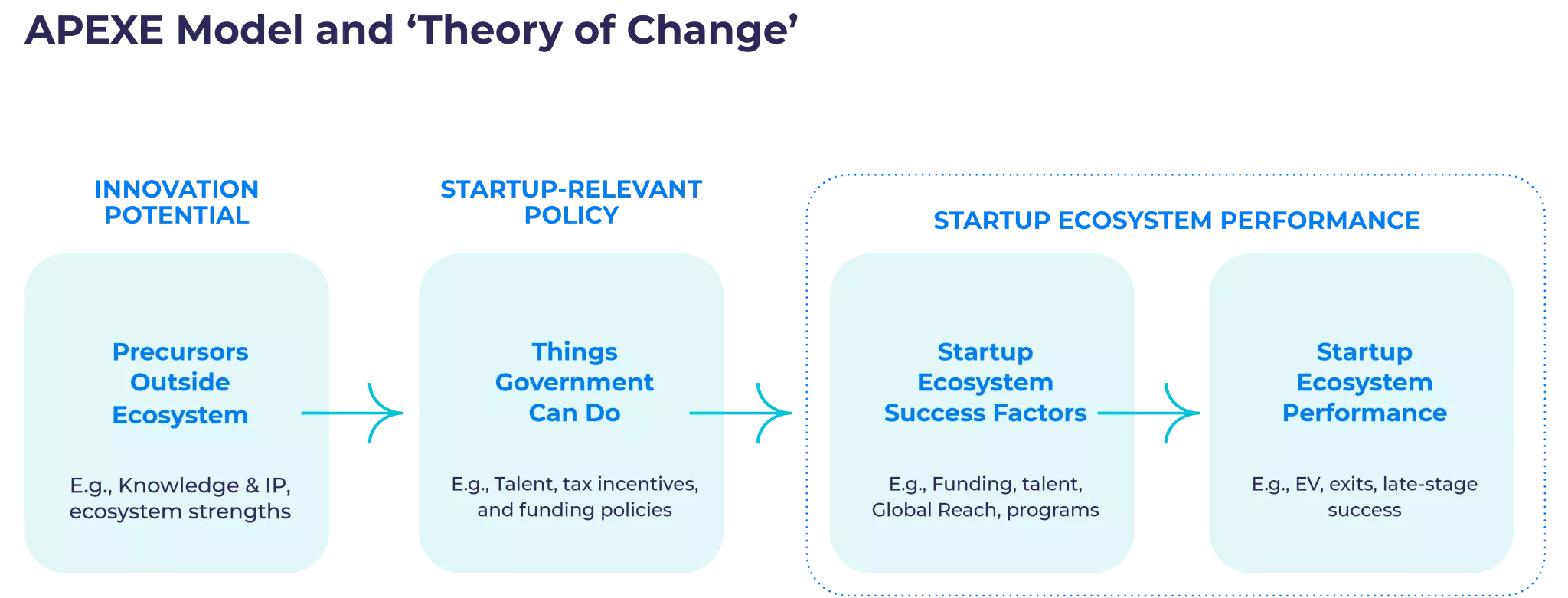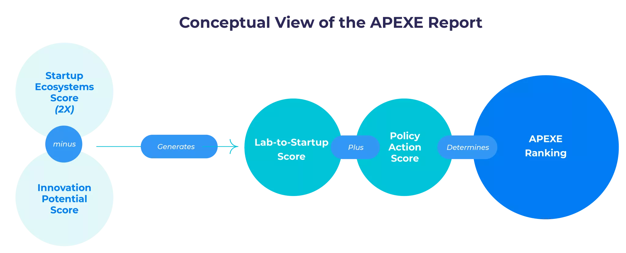 The APEXE Report takes a different approach to many other indices: rather than just measuring the factor conditions for entrepreneurial innovation (which one might consider “inputs”), or examining metrics relating to entrepreneurial activity and performance, it examines the difference between certain factor conditions and entrepreneurial activity and performance. It also scores relevant startup policies a country has put in place.