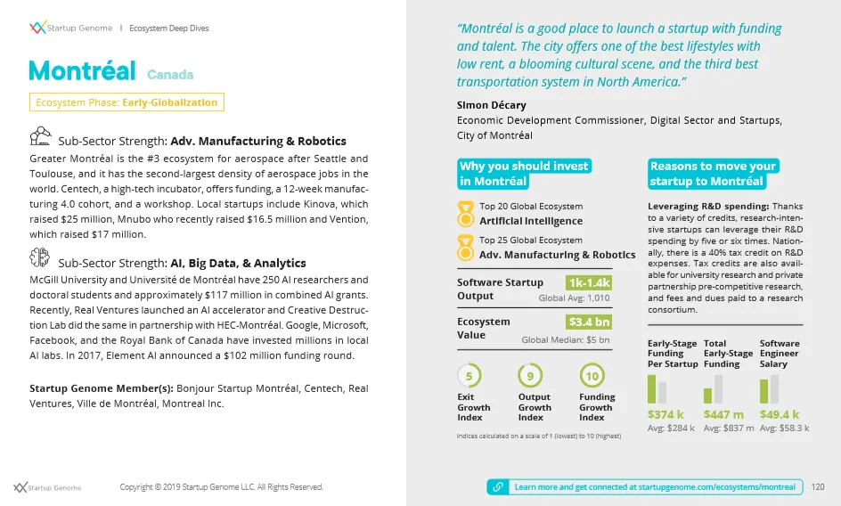 Montréal is growing into a great startup hub and our 2019 Global Startup Ecosystem Report even calls it a Challenger startup ecosystem. In fact, Montréal has become known as one of the leading centers for AI research. The Montréal Institute of Learning Algorithms (MILA) connects AI researchers from McGill University and The University of Montréal. With the high concentration of AI scientists and the largest group of deep-learning researchers in the world, it will come as no surprise that Montréal is seeing success in sub-sectors such as Advanced Manufacturing, Robotics, AI, Big Data, and Analytics.