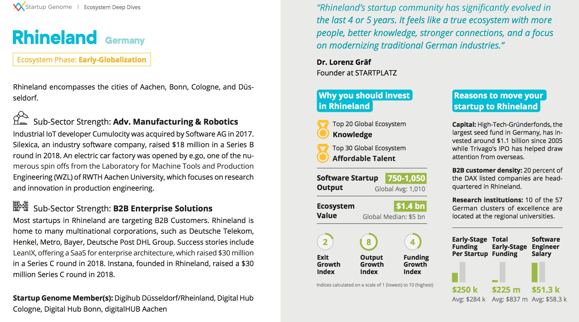 Some additional startup ecosystem highlights about Rhineland from the 2019 Global Startup Ecosystem Report include: