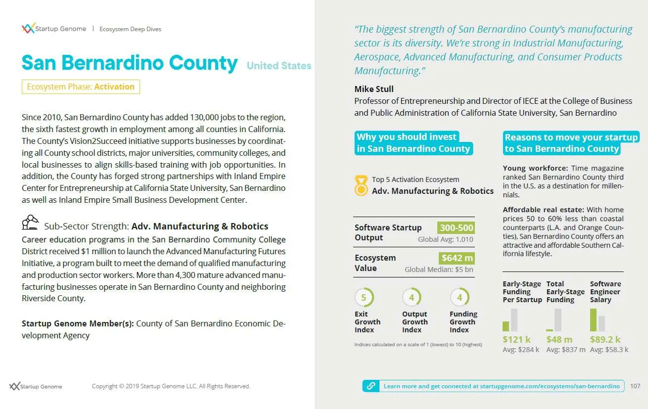 - San Bernardino is in the top five activation ecosystems for Advanced Manufacturing and Robotics.