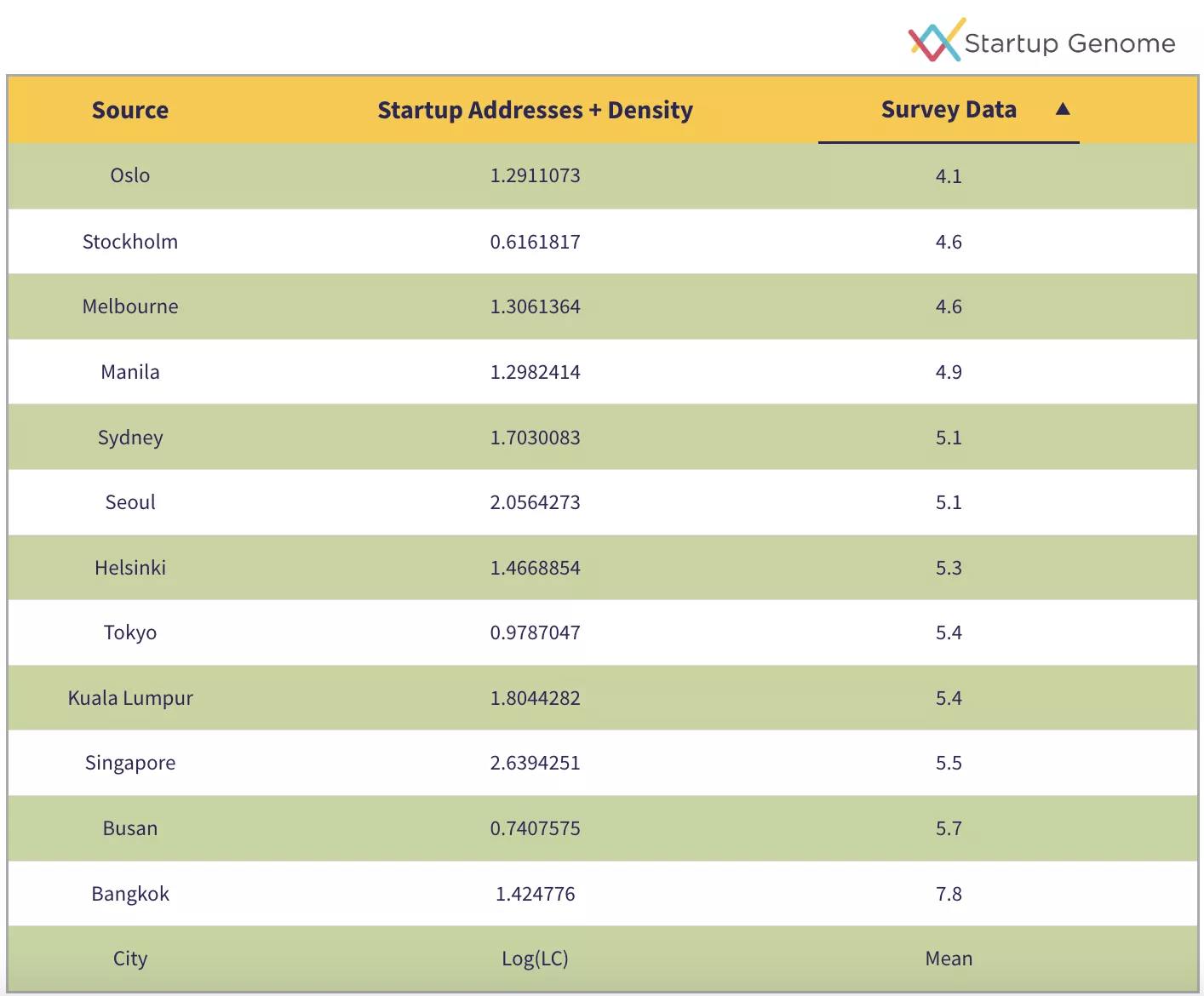 So what was the outcome? The table above is sorted by the average Local Connectedness gathered from our survey results. It shows that there is a considerable correlation between the two metrics. Cities with high startup cluster density also show a high level of Local Connectedness based on survey data. We see that Singapore, Seoul, and Kuala Lumpur match the trend as highly connected startup ecosystems.