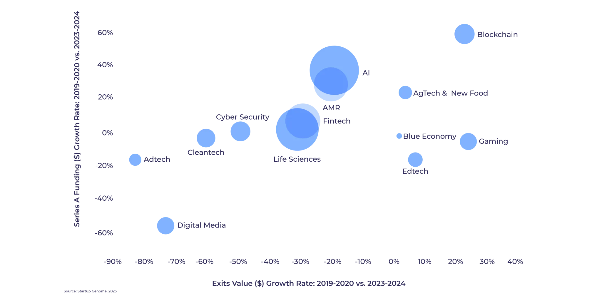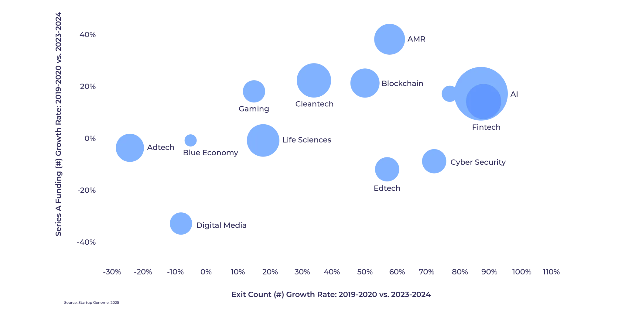 For the year ahead, we wait to see whether the impact of U.S. budget cuts and policy shifts – such as reduction in the spending on the National Institute of Health and withdrawal from the Paris Agreement on climate change mitigation – will impact startup formation in these sectors. However, we predict that AI will remain the major growth sector, and will draw increasing proportions of venture capital. Moreover, it seems inevitable that AI will increasingly be integrated into other sectors, especially Life Sciences and AMR, such that the sectoral boundaries may need to be revisited.