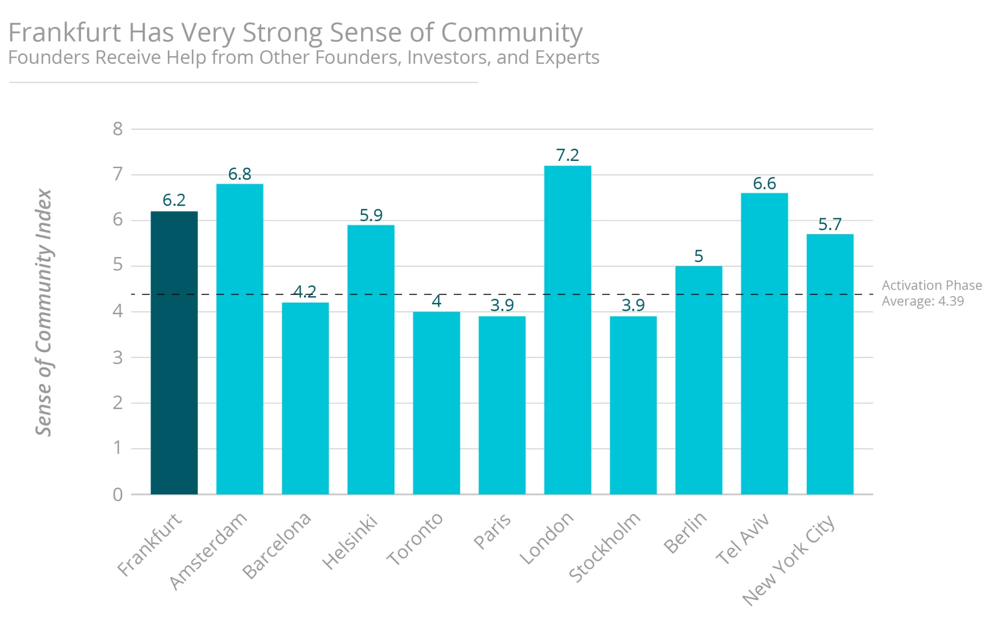 Startup Genome’s ‘Frankfurt Startup Ecosystem Report’—commissioned by Goethe University, alumni and serial entrepreneur, Yi Shi, and local startup hub TechQuartier—identifies Frankfurt as in the Activation phase of the Ecosystem Lifecycle. While still relatively small in size, Frankfurt’s startup ecosystem already has a strong culture of founders helping founders (measured as Sense of Community), which contributes to the growing vibrancy. Frankfurt founders also have higher Global Connectedness than in peer ecosystems. To continue globalizing and growing as an ecosystem—as envisioned by the region’s Masterplan—the region’s large corporations and world-class universities will be key sources of leverage.
